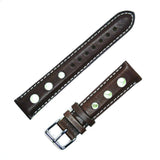 Rallye trous sports watchband in dark brown calf with white stitching and edges.