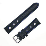 Rallye trous sports watchband in black calfskin with blue stitching and edges.