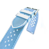 Le bracelet caoutchouc skinskan bleu pistis Rallye (TROPIC) est disponible immédiatement et existe en différentes largeurs. Largeurs : 22 et 20mm. Les longueurs sont standards (M) : 115mm pour la grande partie et 75mm pour la petite partie. Le bracelet montre a une épaisseur de 5.5mm au plus haut et 2.8mm au plus bas.